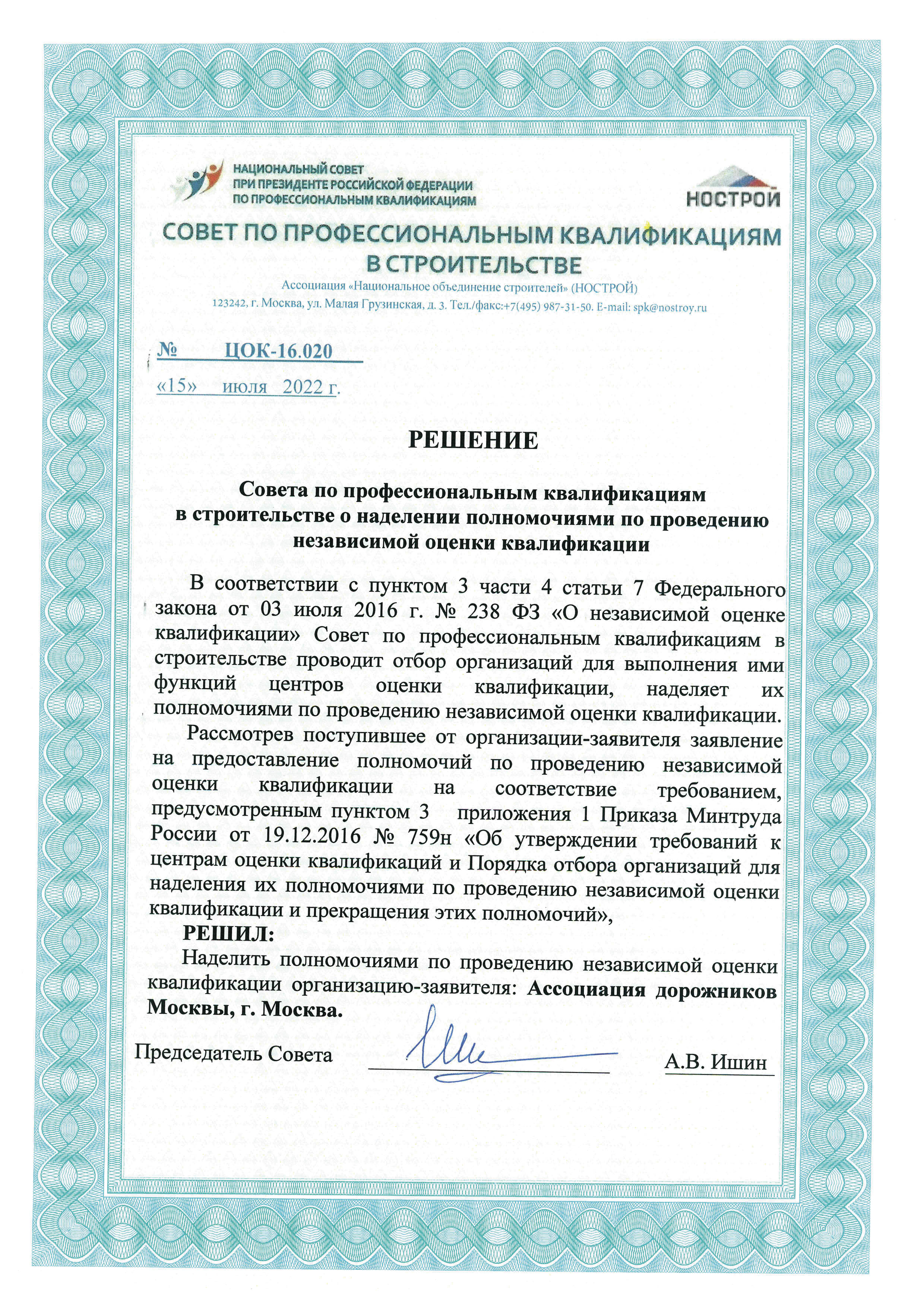 РЕШЕНИЕ о наделении Ассоциации дорожников Москвы полномочиями на